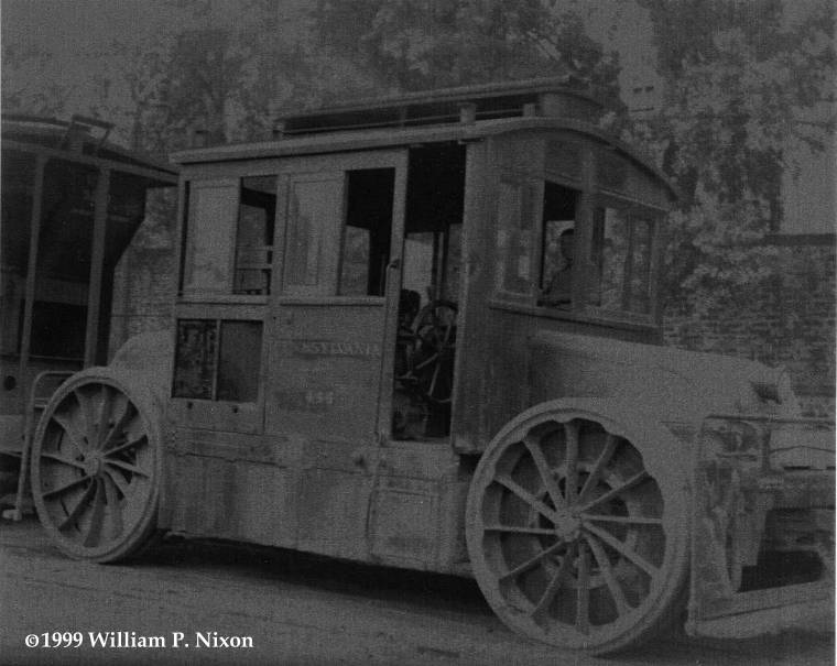 Ken Briers wrote in with the following: "I actually worked on the modern tractors a few times. The crew consisted of two Trainmen and a Conductor. I would imagine that one thing that kept this service going so long was the ability to avoid the cost of an Engineer. One of the Trainmen drove the tractor, and to do this, he had to be qualified as a "Chauffeur". The tractors had drawbars that would slide back and forth to compensate for the difference in "tracking" of the tractor from the rail-bound cars. In the modern tractors the chauffeur could actually move the drawbar from side to side remotely to align its coupler with that of the car to be coupled to. The olders models may also have had this feature, but I was never around them. The most dangerous thing about working on the street was remembering to look for traffic when you stepped out from between the cars after coupling hoses. "