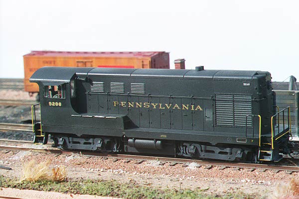 A lazy spring day in the Panhandle area finds a P. Co. FS-10 (FM H-10-44) working a small rural yard during the mid 50's. The unit is a rebuilt Walthers FM H-10-44 to Pennsy FS-10 spec.'s. It will be a subject of an up coming article in Mainline Modeler. As you can see in bright sunlight, Yes, Virginia, DGLE did have a slight green tint, at least in Ektachrome!text by Greg Martin
