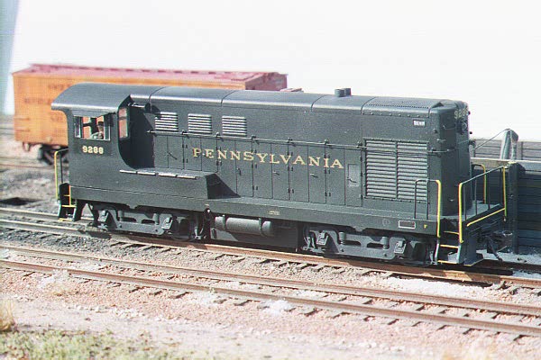 A lazy spring day in the Panhandle area finds a P. Co. FS-10 (FM H-10-44) working a small rural yard during the mid 50's. The unit is a rebuilt Walthers FM H-10-44 to Pennsy FS-10 spec.'s. It will be a subject of an up coming article in Mainline Modeler. As you can see in bright sunlight, Yes, Virginia, DGLE did have a slight green tint, at least in Ektachrome! text by Greg Martin